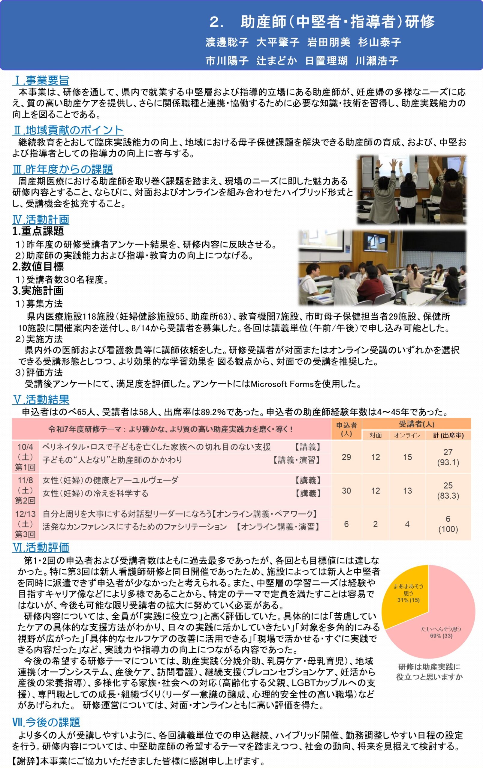本研修は、平成21年度より、三重県から「院内助産所・助産師外来開設のための助産師等研修事業(平成21~23年度)」、「助産師(中堅者・指導者)研修事業(平成24~28年度)」、「助産師(中堅者)研修事業(平成29~令和4年度)」、「助産師(中堅者・指導者)研修事業(令和5年度~)を受託し、県内で就業する助産師が、妊産婦の多様なニーズに応え、質の高い助産ケアを提供し、さらに関係職種と連携・協働するために必要な知識や技術を習得し、助産実践能力の向上を図るための支援を行う研修です。