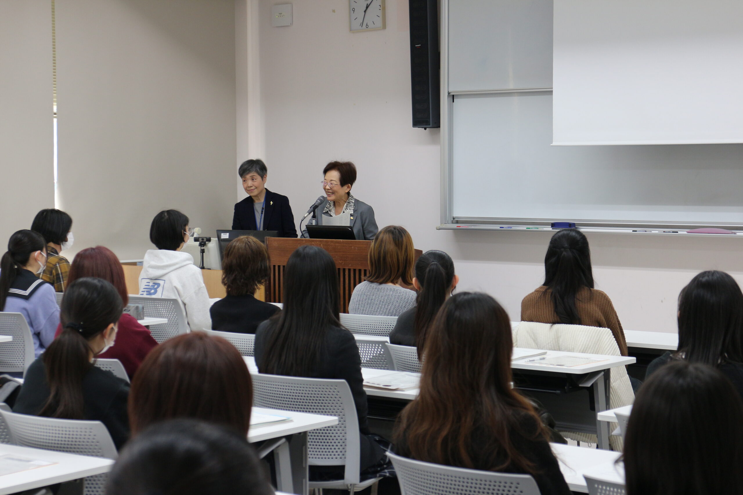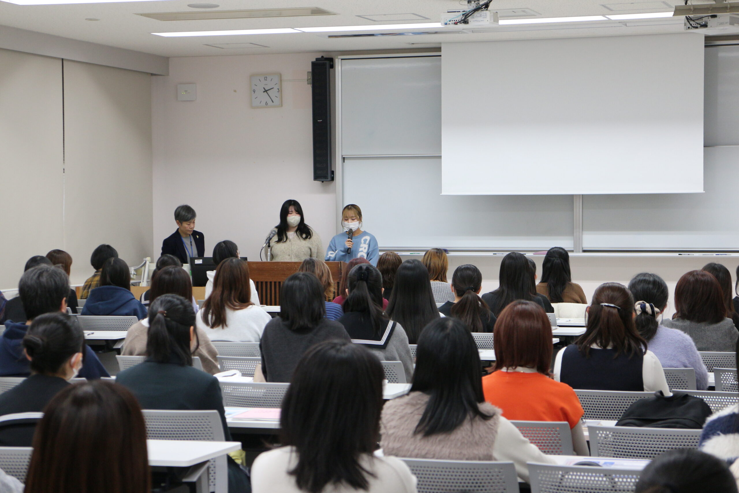 本学の企画情報担当理事である大平 肇子 教授から、県立大学である本学の使命や入学までの過ごし方、入学後の授業や行事などについてお話ししました。