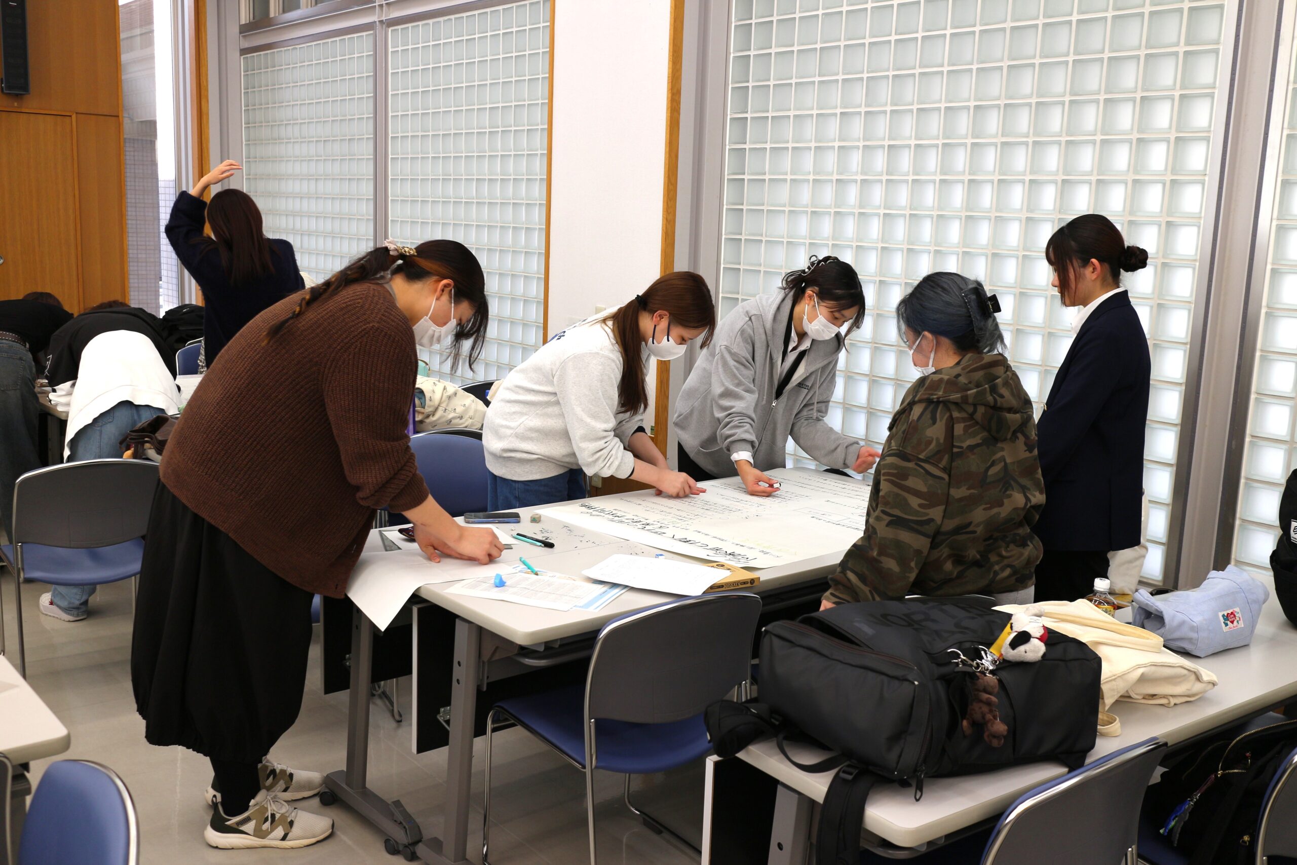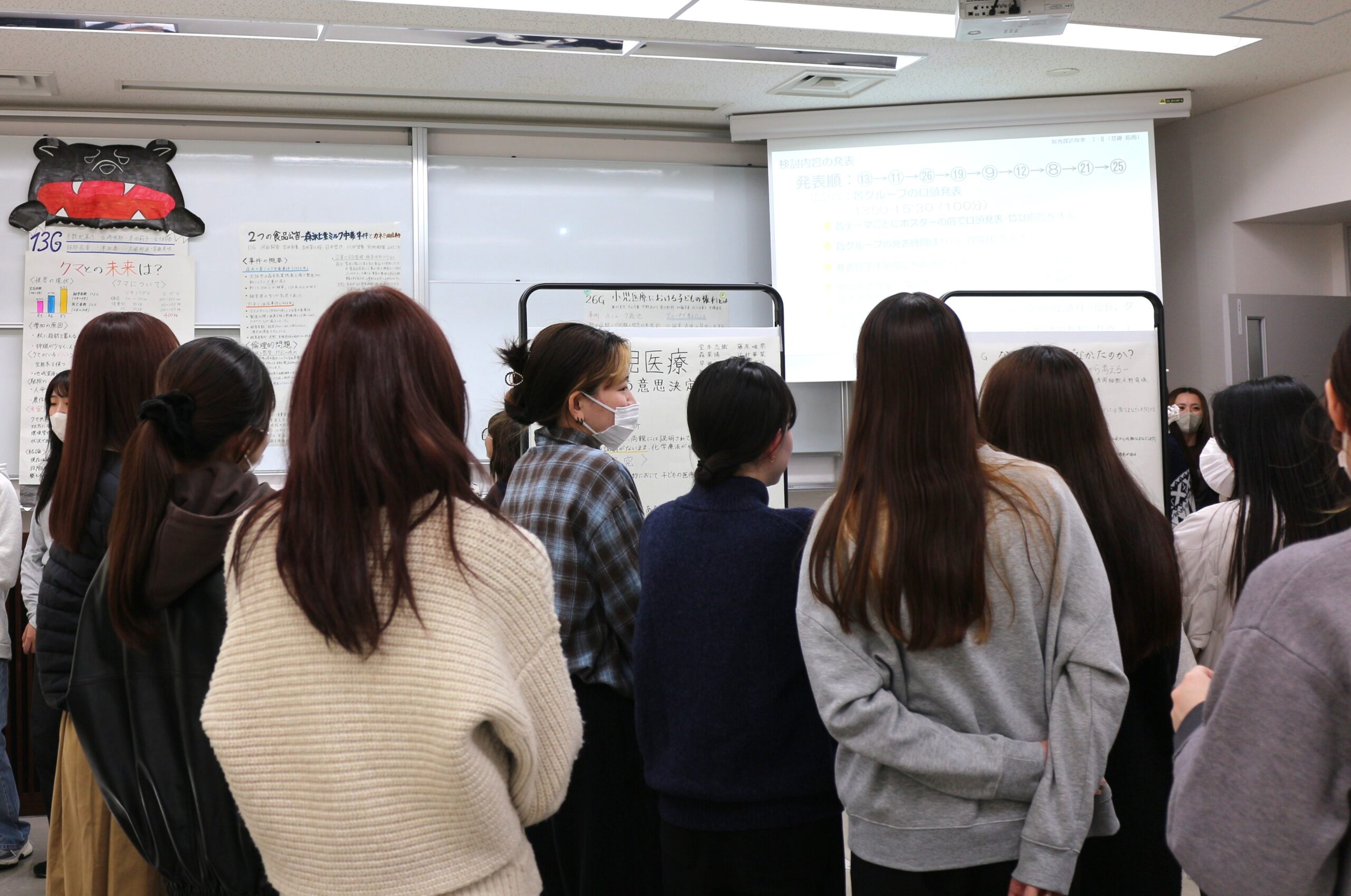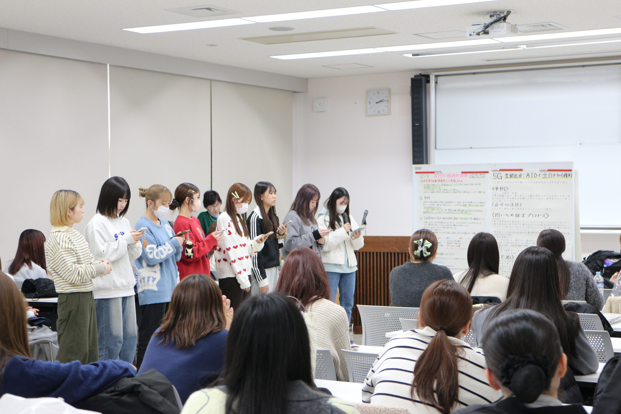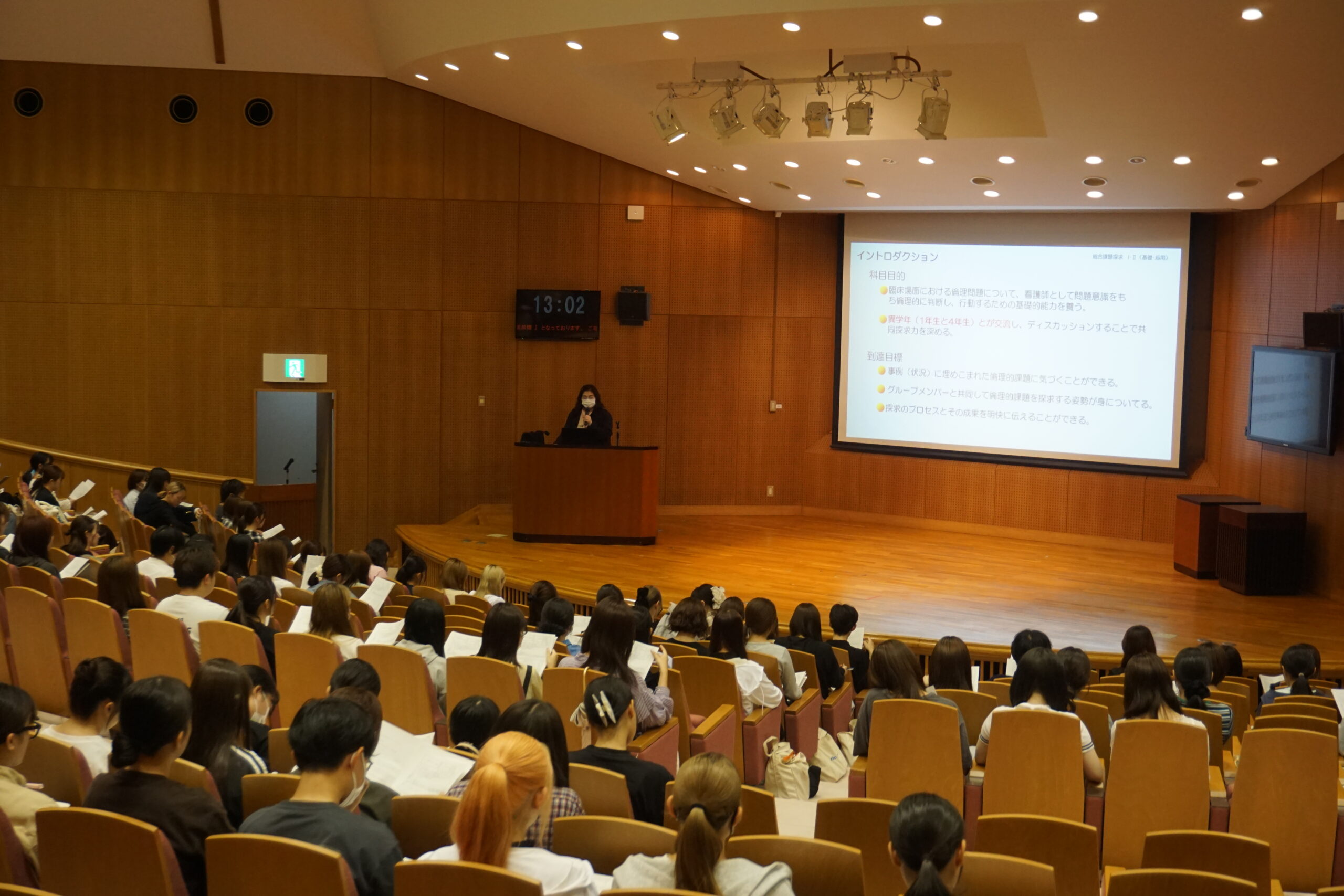本学では、将来学生が直面するであろう臨床現場における倫理的な課題に看護職者としてよりよく対応できる力を養うために「総合課題探求Ⅰ・Ⅱ」という科目を設置しています。この科目は、1年生と4年生で同時開講し、学年を超えて多様な考え方を持つメンバーと交流しつつディスカッションすることで、共同探求力を深めるねらいもあります。
